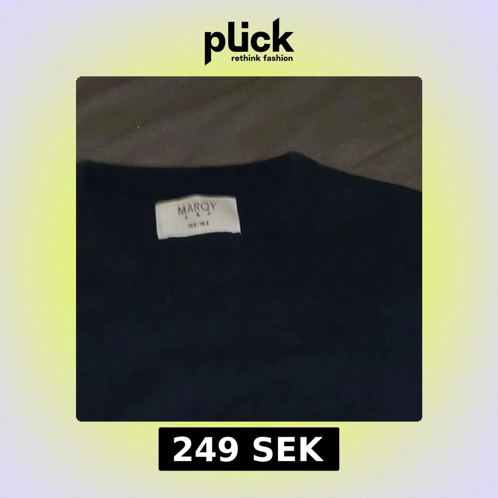 Mörkblå stickad tröja från MARQY i storlek 158/164. Klassisk modell med rund halsringning och ribbade muddar vid ärmslut och nederkant. Perfekt för lager-på-lager under kyliga dagar. Finns ett litet gammalt hål på högra armen men är sytt igen och man märker det inte.