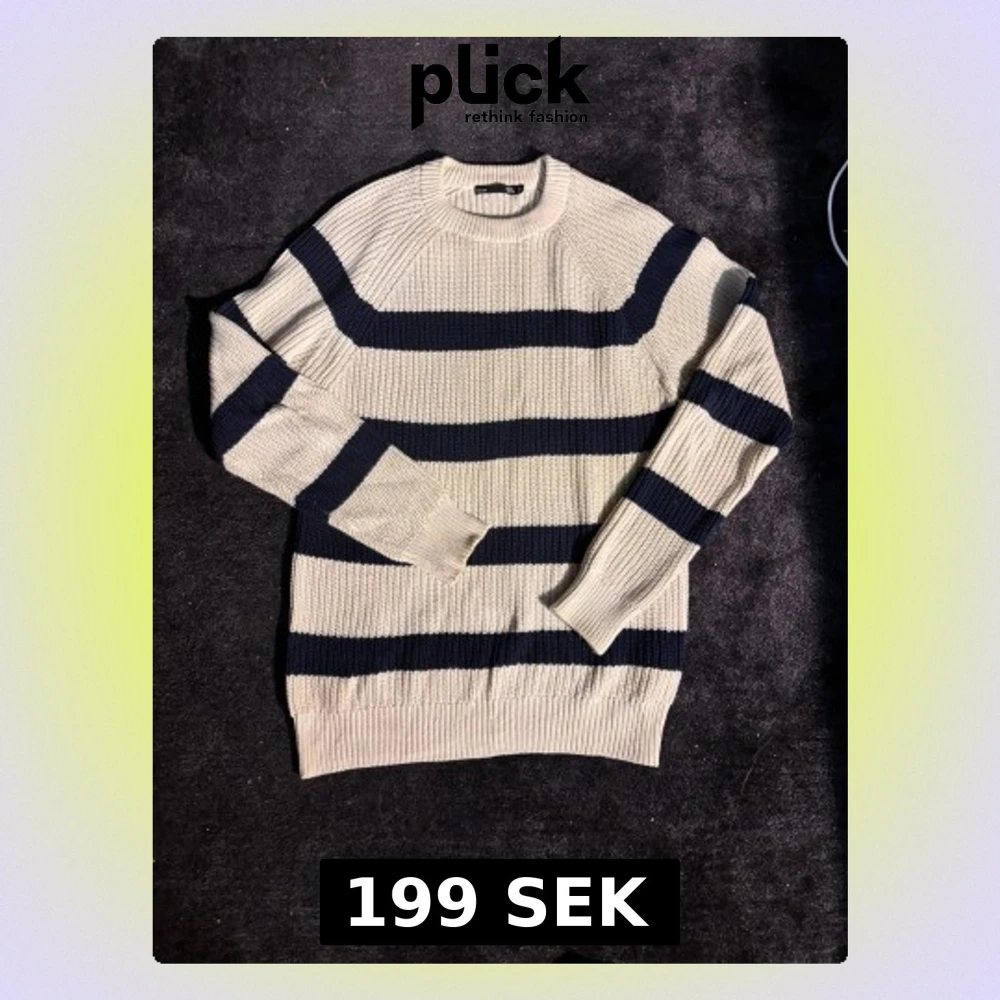 Säljer en grovstickad tröja med breda marinblå och beige ränder. Tröjan har rund halsringning, lång ärm och ribbade muddar. Perfekt för dig som gillar en chill och klassisk look med lite nautisk vibe.