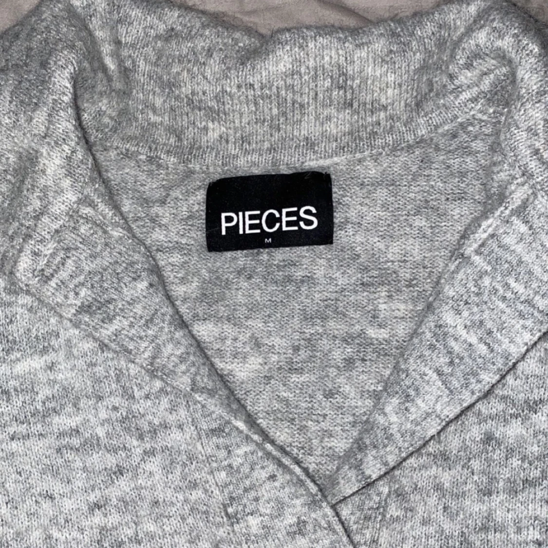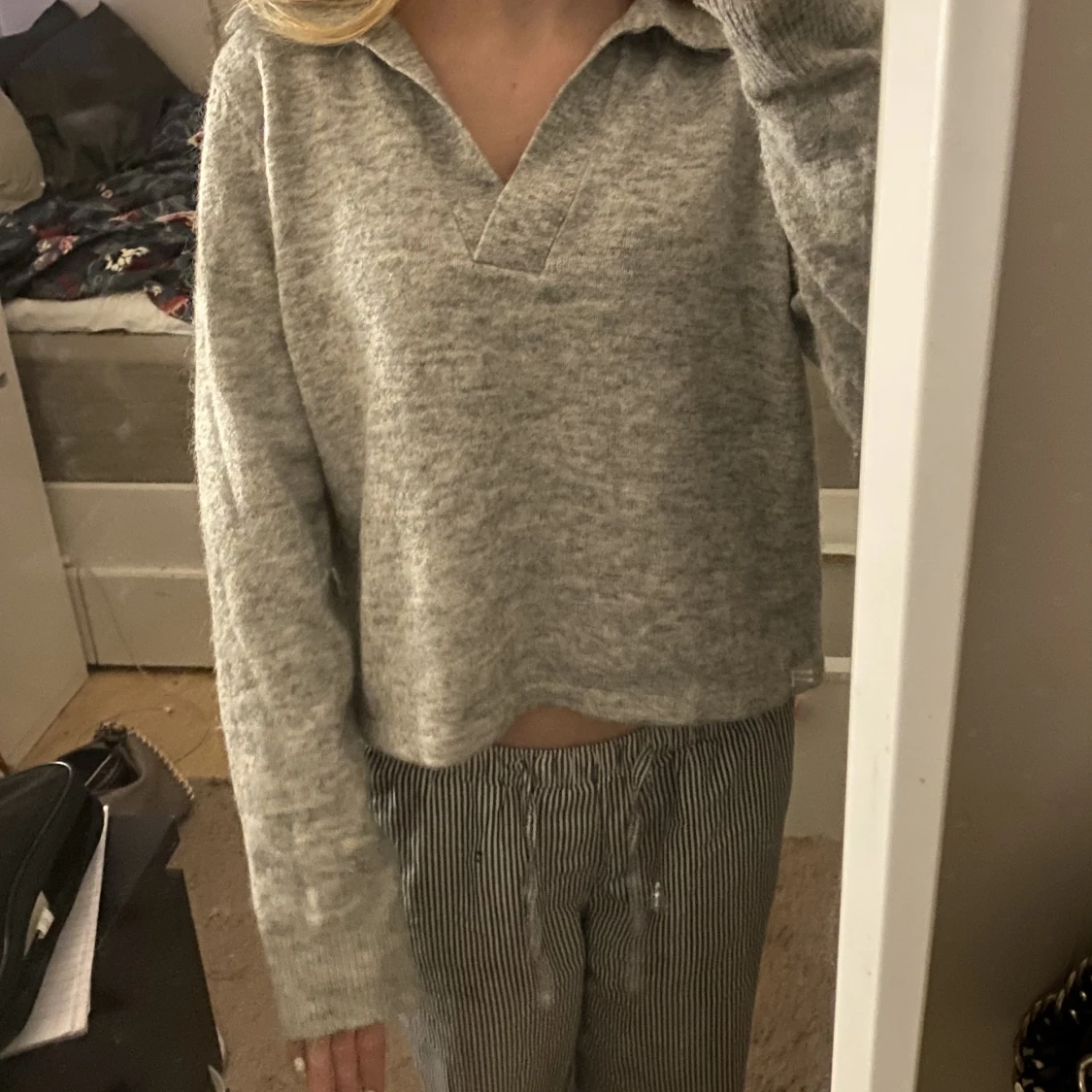 En grå stickad v-urringad tröja med krage ifrån about you ”flavia” i storlek M men passar mig perfekt som har xs/s. Använd fåtal gånger, har inga hål eller annat💗 (nypris 325kr)