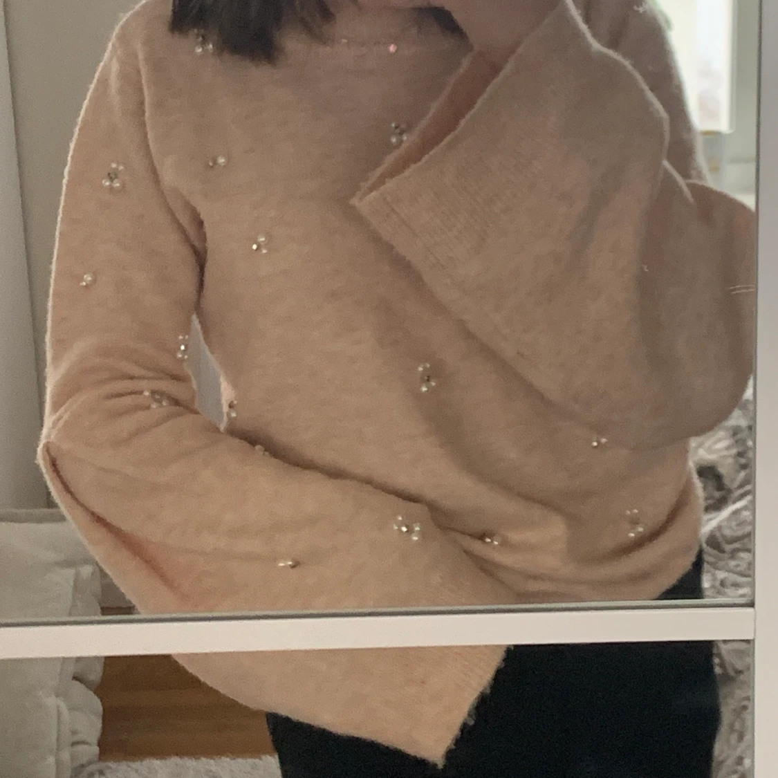 Jätte fin och mjuk stickad tröja. Med pärlor på framsidan, utsvängda armar och ett fint veck vid armbågen. Använd fåtal gånger i nyskick utan några noppror.Bara skriva vid frågor elr intresse. 150 +frakt🥰