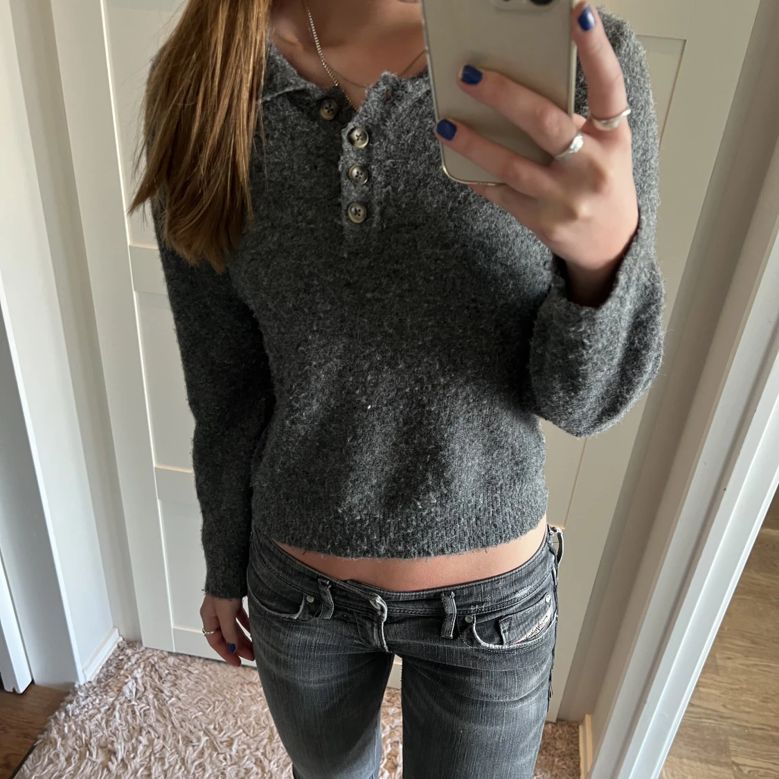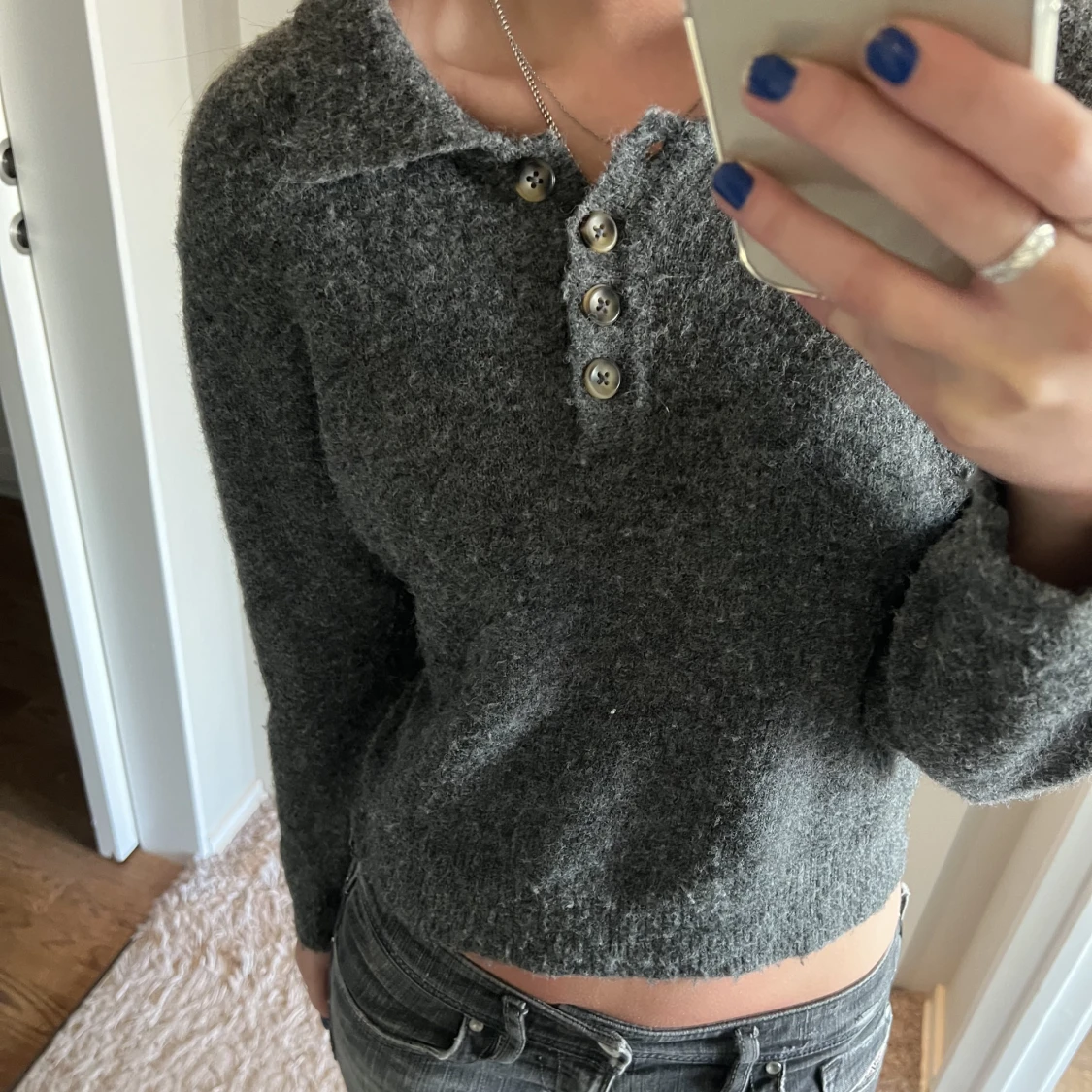 Så fin stickad tröja med krage, lite kortare i modellen men inte croppad. Sjukt mjukt material!! Storlek S men passar även Xs💕 (150kr + frakt 66kr)