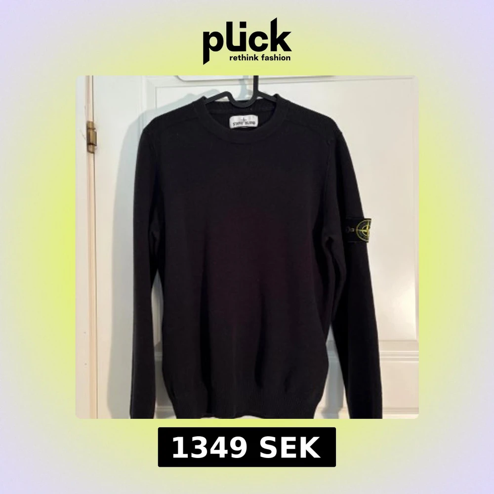Säljer en svart stickad tröja från Stone Island med klassisk rund hals och ribbade muddar. Tröjan har den ikoniska loggan på vänster ärm och är perfekt för dig som gillar stilrena plagg med streetkänsla.