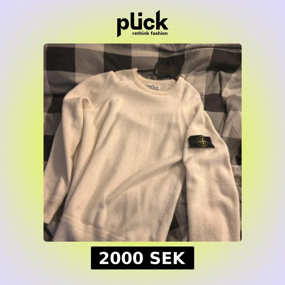Säljer en clean vit stickad tröja från Stone Island med klassisk patch på ärmen. Tröjan har rund halsringning, ribbade muddar och är långärmad. Perfekt för dig som gillar stilren och enkel design med premiumkänsla.