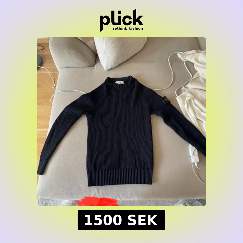 Säljer en mörkblå ribbstickad tröja från Stone Island med klassisk patch på ärmen. Tröjan har lång ärm, högre krage och är i ett mjukt, stretchigt material som sitter snyggt på kroppen. Perfekt för dig som gillar stilren och sportig design.