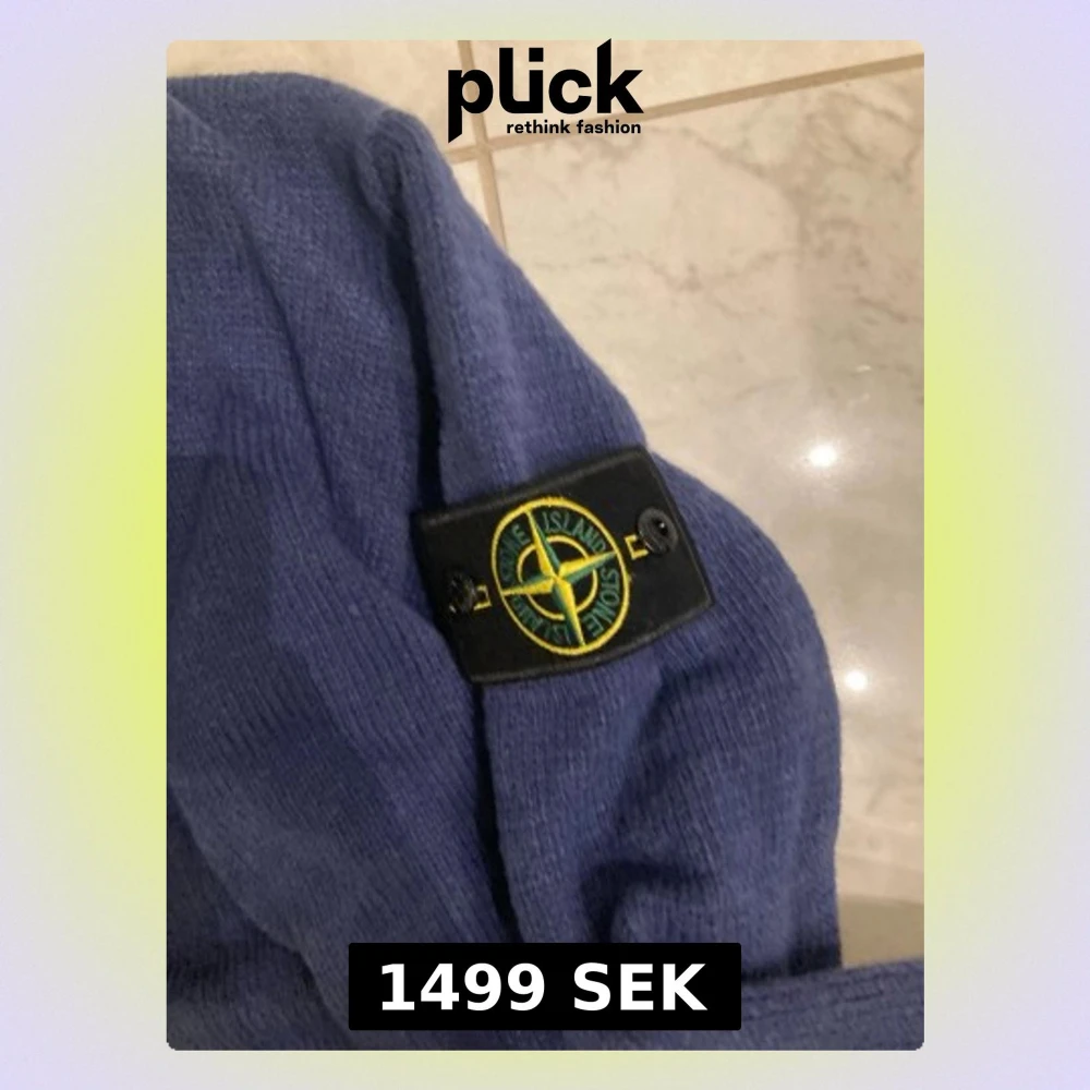Säljer en blå stickad tröja från Stone Island med klassisk patch på ärmen. Tröjan har rund halsringning och ribbade muddar. Perfekt för dig som gillar streetwear och vill ha något stilrent och bekvämt.