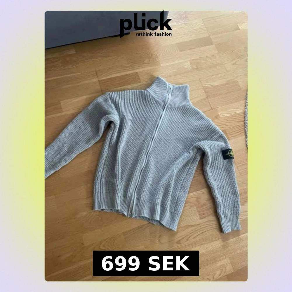 Säljer en ljusgrå stickad tröja från Stone Island med hög krage och ribbstickad struktur. Tröjan har lång ärm och den klassiska Stone Island-loggan på vänster ärm. Perfekt för dig som gillar streetwear och snygga detaljer. M men passar S också, helt ny oanvänd