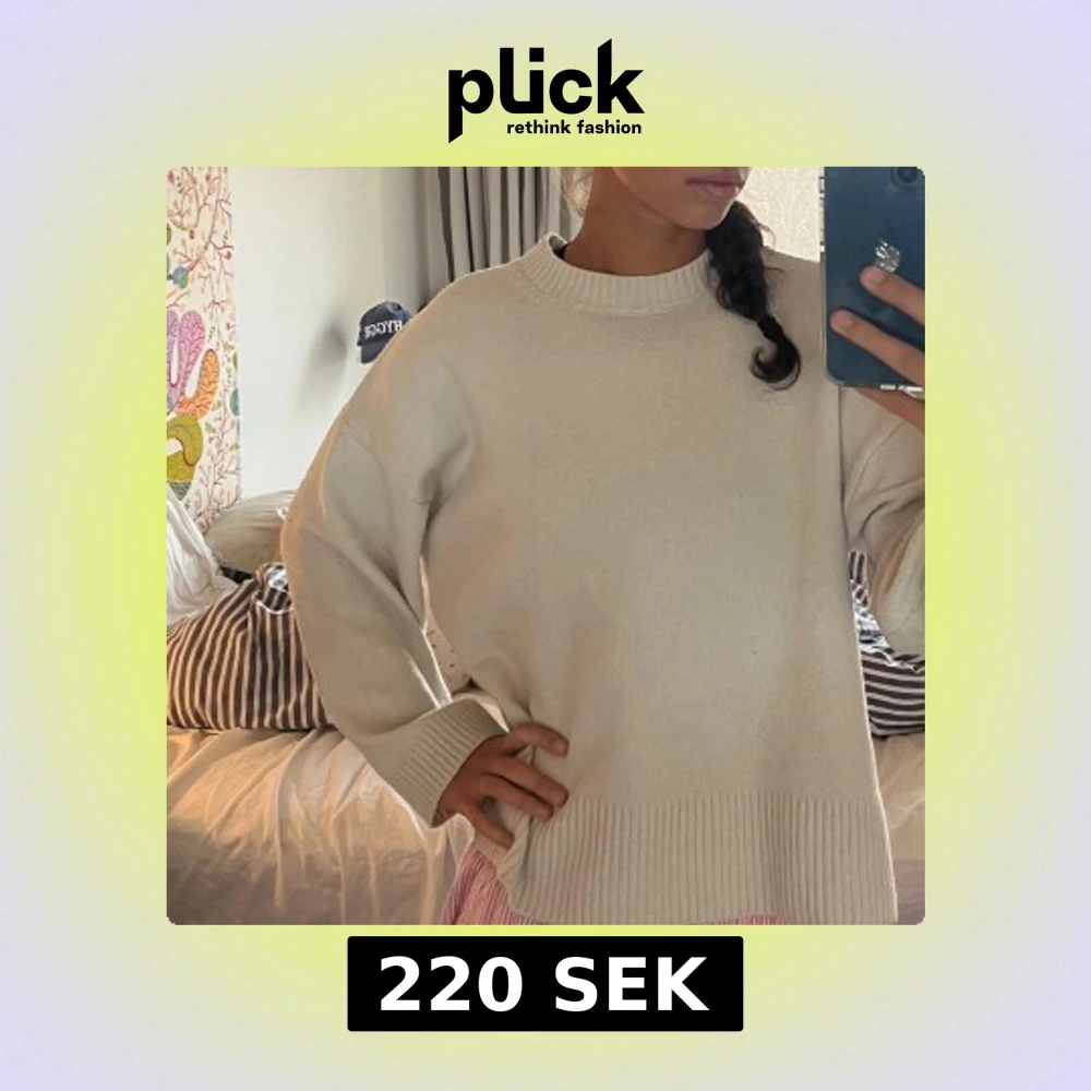 Säljer en beige oversized stickad tröja med breda ribbade muddar vid ärmslut och nederkant. Tröjan har en rund halsringning och långa ärmar, perfekt för lager-på-lager och chill dagar.