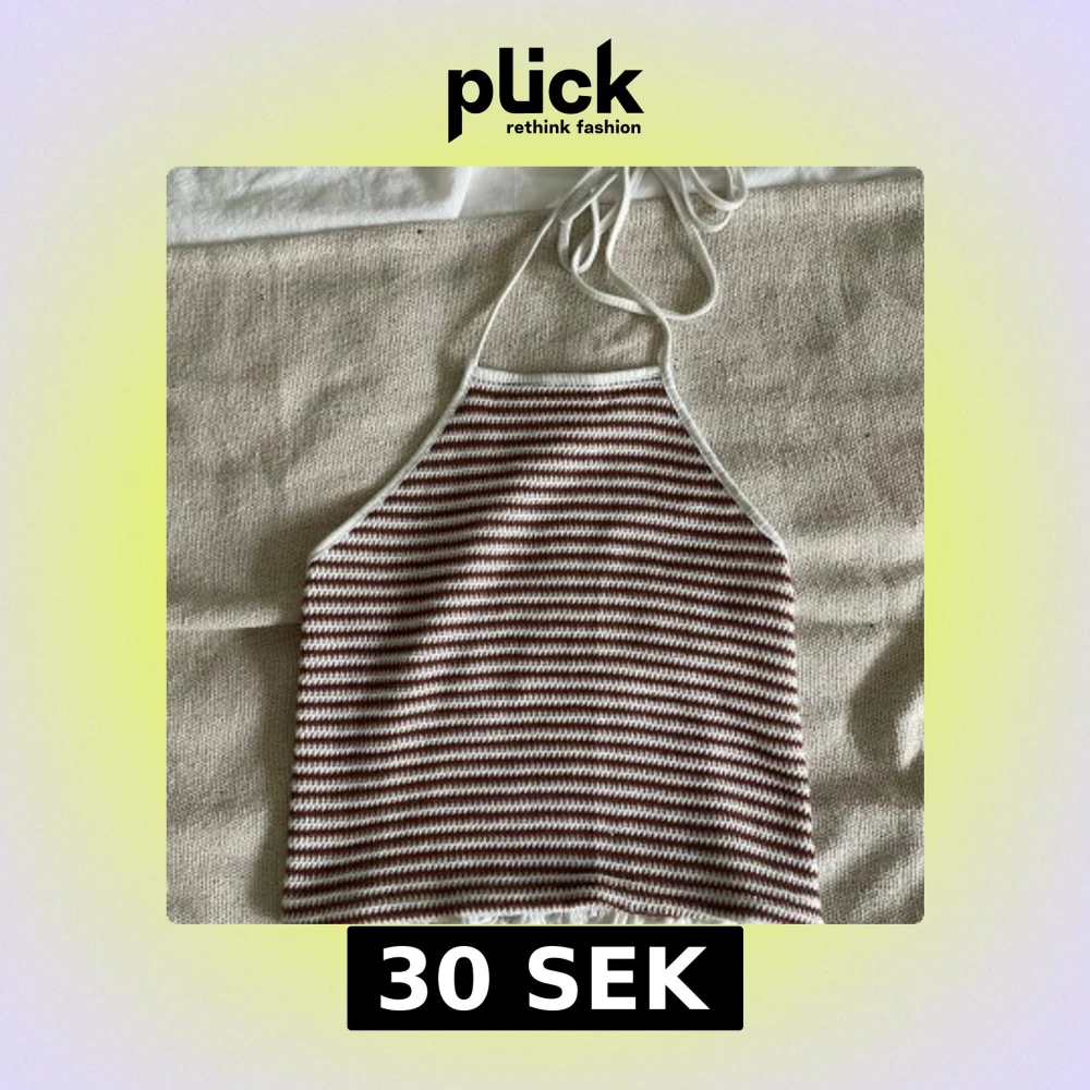 Säljer en croppad linnetopp med smala axelband som knyts i nacken. Toppen har ett randigt mönster i vitt och brunt, och är tillverkad i ett stickat material. Baksidan har en smockad panel med volangkant för extra stretch och snygg passform.