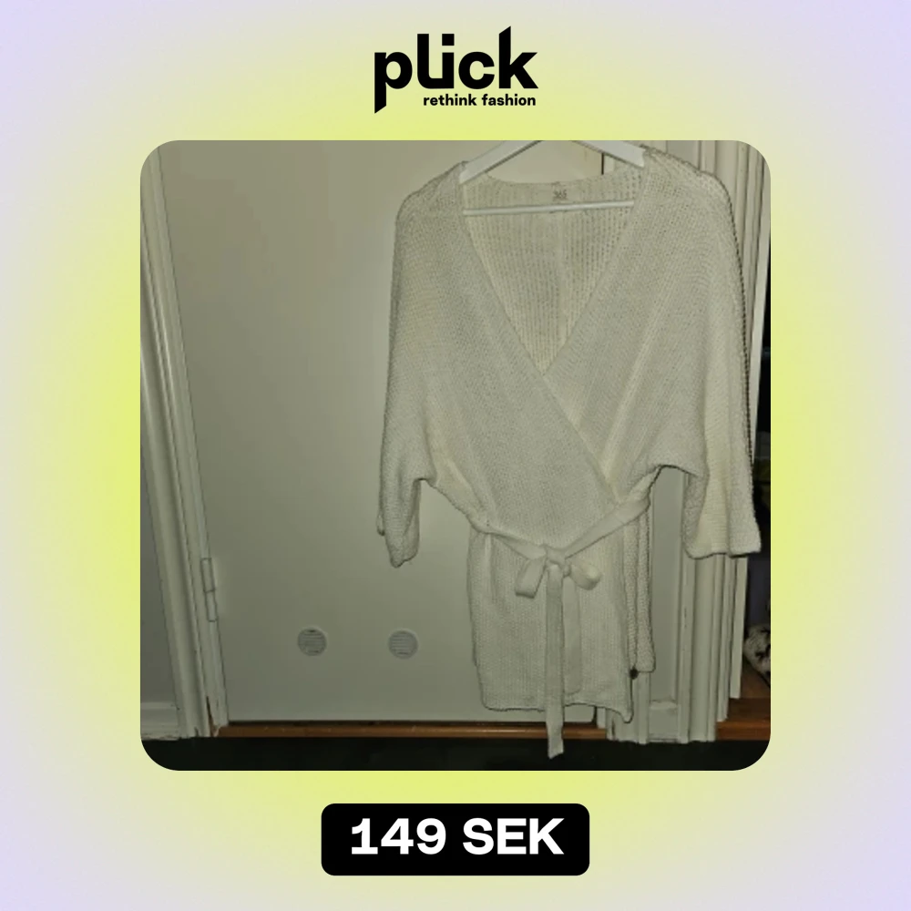 Ny En vit stickad kofta med bälte. Kofta har en V-ringning och är i en lös passform. Den har 3/4 ärmar. Står strl S men passar en som jar M också Katt finns I hemmet