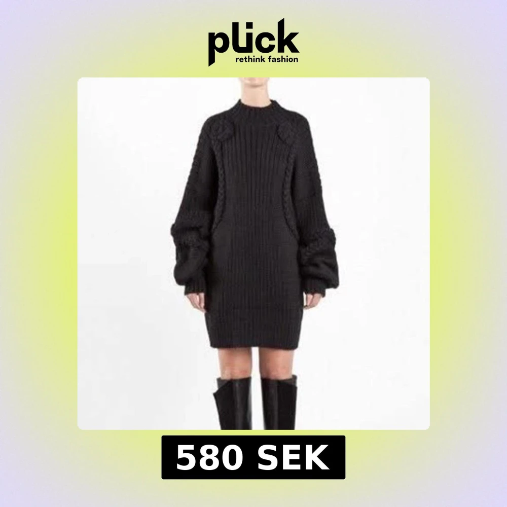 Svart stickad tröja från Carin Wester med oversized passform, ballongärmar och flätade detaljer längs ärmar och sidor. Ribbstickad struktur och hög hals. Kan ävrn användas som klänning. Materialmix av ull, alpacka, bomull och syntet. Perfekt för dig som gillar statement-plagg med cool siluett. Inga anmärkningar, mycket fint skick utan noppor.