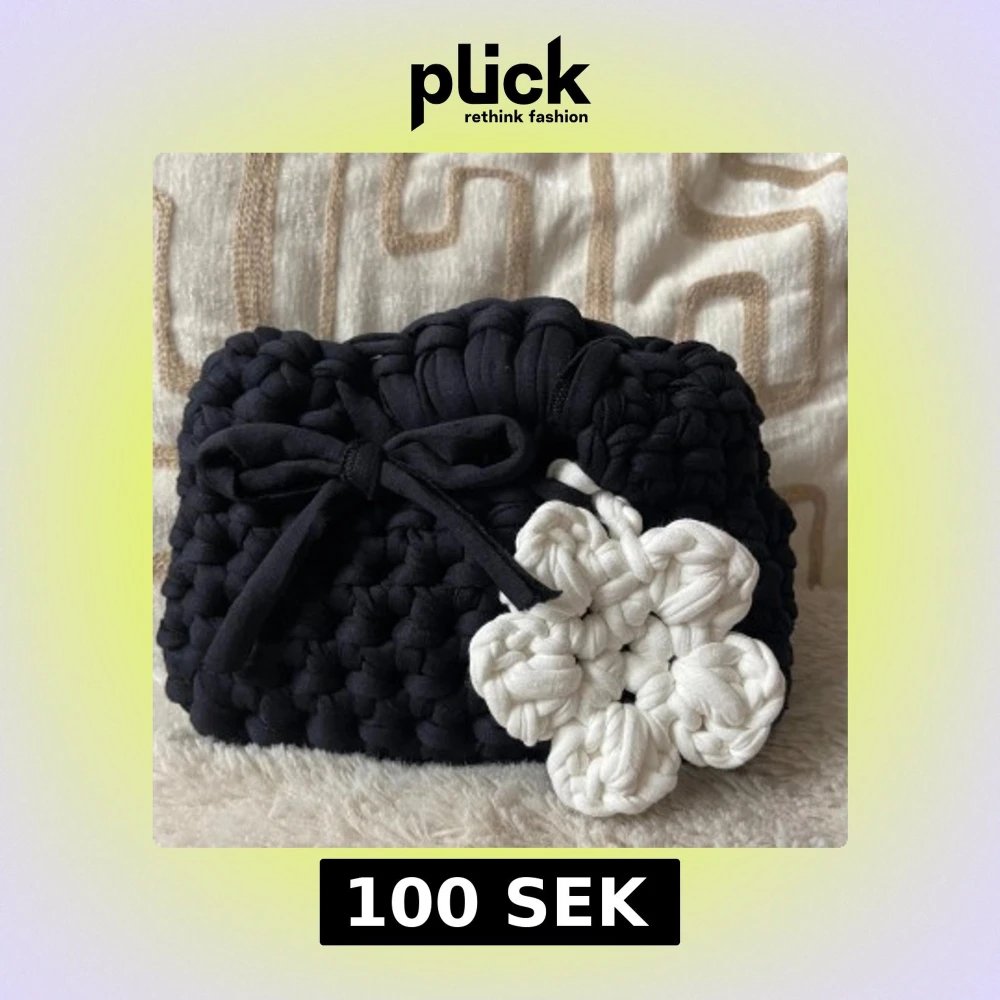 Unik svart handväska i grovt virkat tyg med en stor vit virkad blomma som detalj. Väskan har en söt knytrosett framtill och är perfekt för dig som vill sticka ut med en personlig accessoar.
