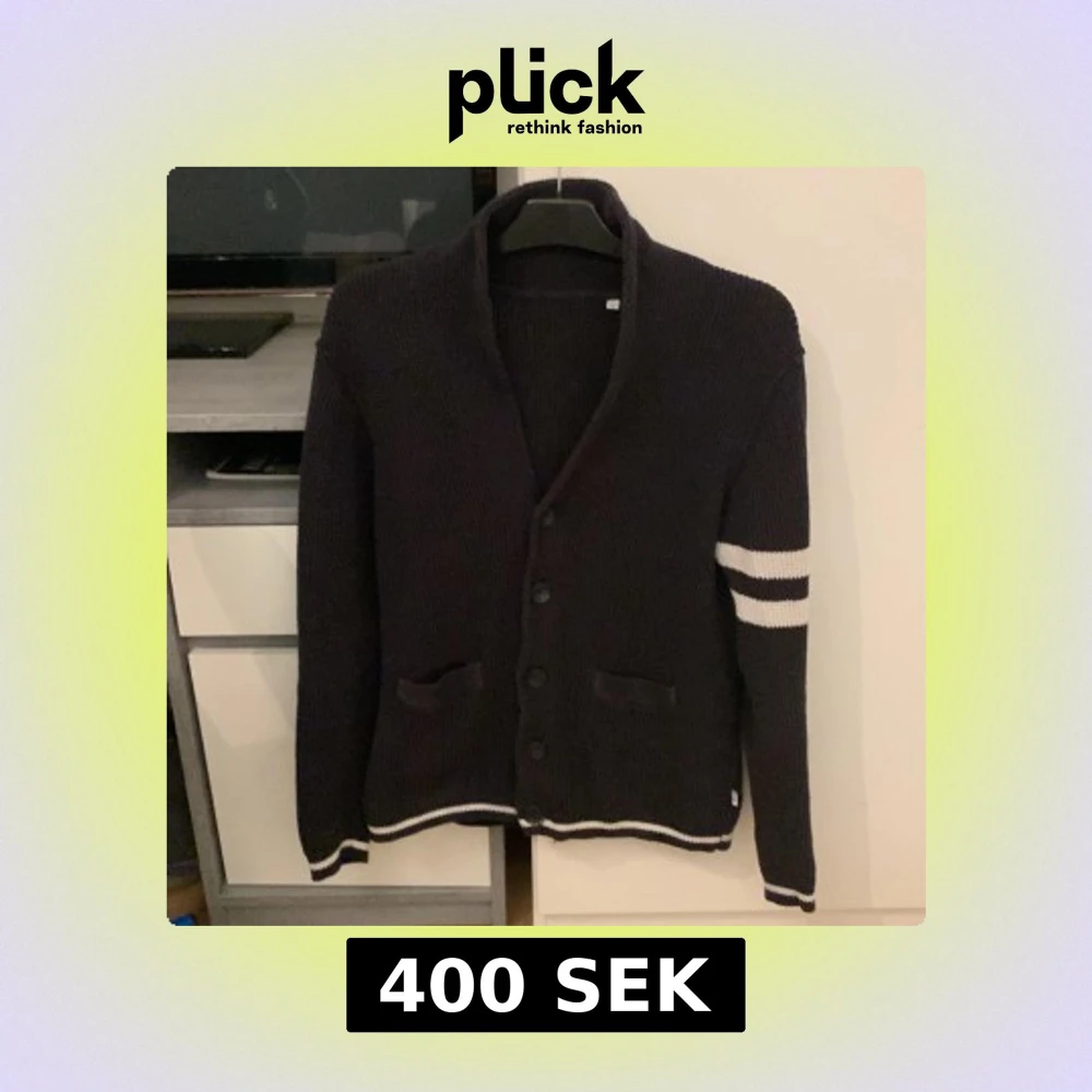 Säljer en snygg svart kofta med vita ränder på ärmarna och nederkanten. Koftan har en ribbad krage och knappar framtill samt två fickor Perfekt för en stilig look. Vid funderingar eller annat tveka då inte att höra av dig!!!