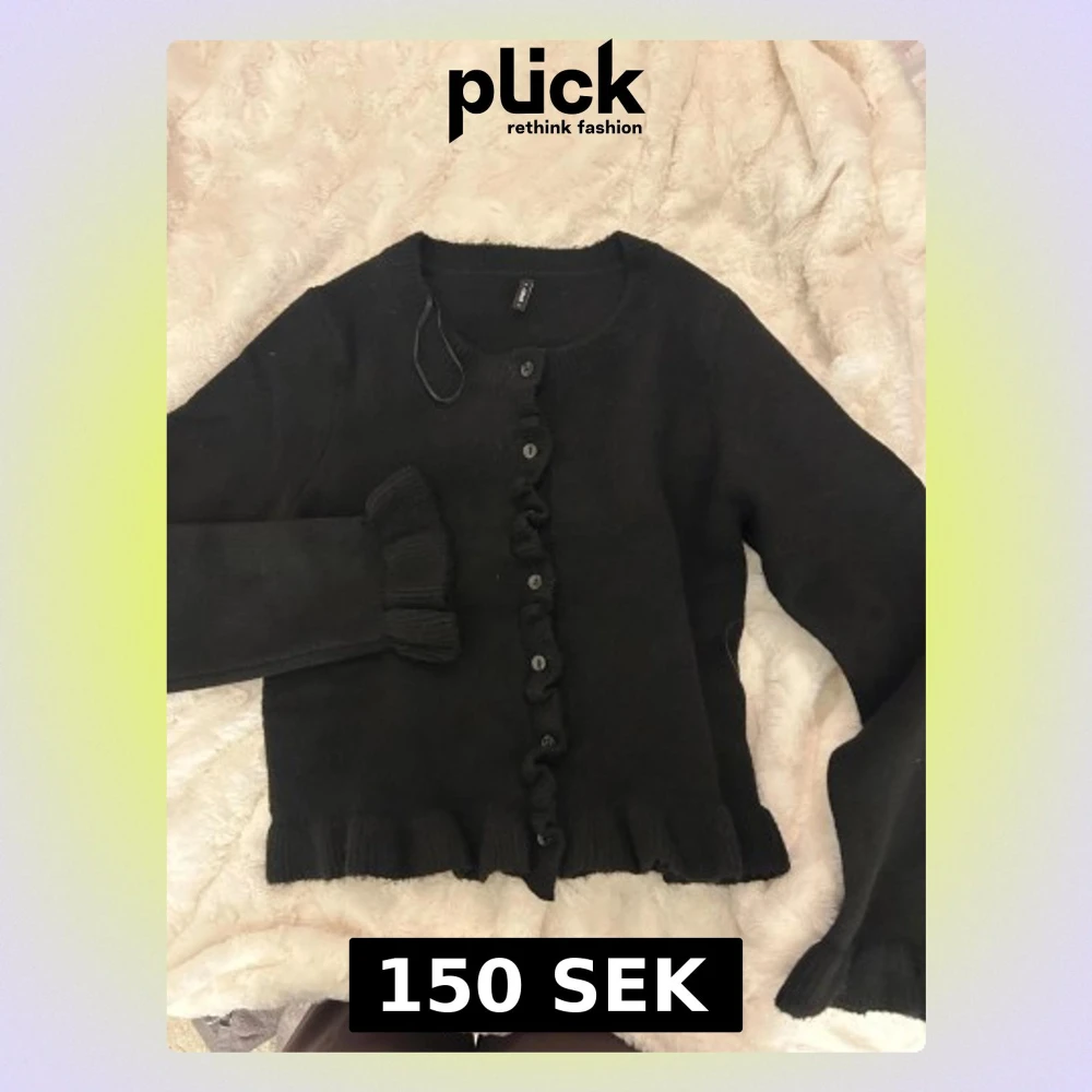 Svart kofta från ONLY i stickat material, med volangdetaljer längs knappraden och vid ärmsluten. Rund halsringning och långa ärmar. Knappar framtill och ribbad kant nedtill. Perfekt för dig som gillar en söt och chill stil.