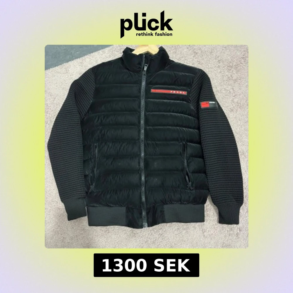 Svart pufferjacka med quiltad kropp och stickade ärmar. Jackan har dragkedja framtill, ribbade muddar. Snygg, modern design som sticker ut med sin mix av material och detaljer. Qr koden finns även på.