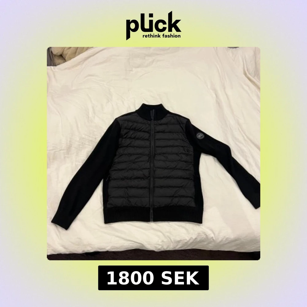Svart pufferjacka från canada goose med quiltad front och stickade ärmar. Jackan har dragkedja hela vägen och en rund canada goose-logga på vänster ärm. Perfekt för dig som gillar stilren design och vill ha något som funkar till många outfits.