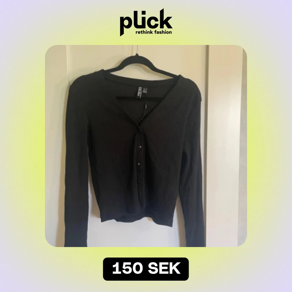 Säljer en snygg svart ribbad tröja som även går att använda som en kofta från Pieces. Den har en v-ringning och knappar framtill. Koftan är i nyskick och har långa ärmar.