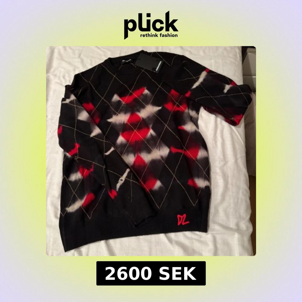 Stickad svart tröja från Dsquared2 med rutigt mönster i rött, vitt och grått samt tunna gula linjer. Snygg broderad röd D2-detalj nertill. Nypris 3600kr, barnstorlek 14Y men passar vuxen XS