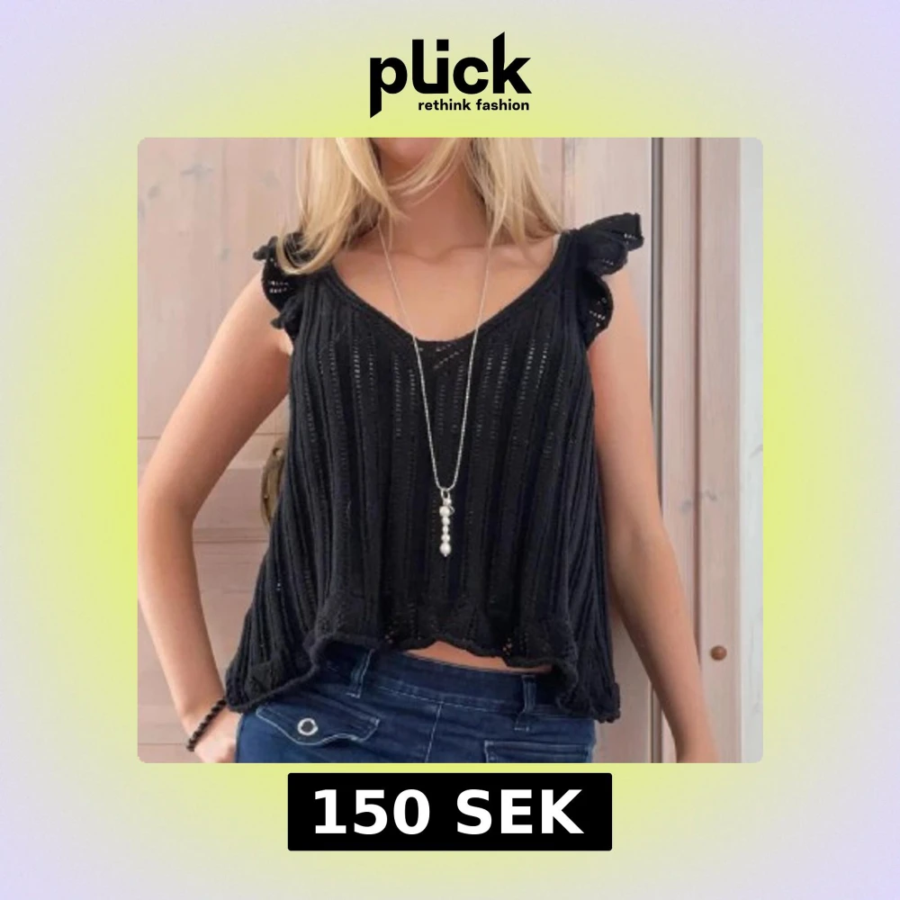 Snygg svart stickad topp med volangdetaljer vid ärmarna. Toppen har en luftig design och är perfekt för varma dagar. Den är ärmlös och har en v-ringad halslinje som ger en stilren look.