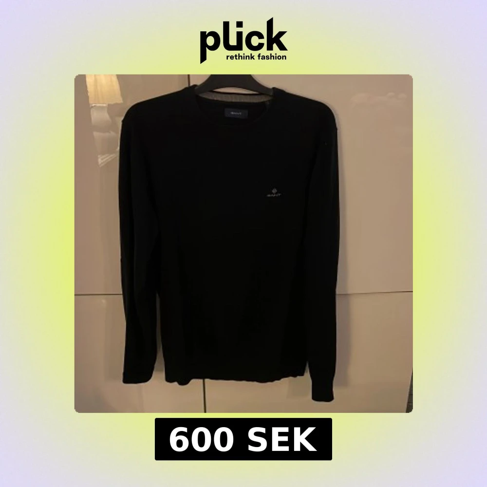 Svart stickad tröja från GANT i storlek L. Klassisk rund hals och diskret logga broderad på bröstet. Tröjan har långa ärmar och ribbade muddar vid hals, ärmslut och nederkant. Perfekt för dig som gillar stilrena och enkla plagg.