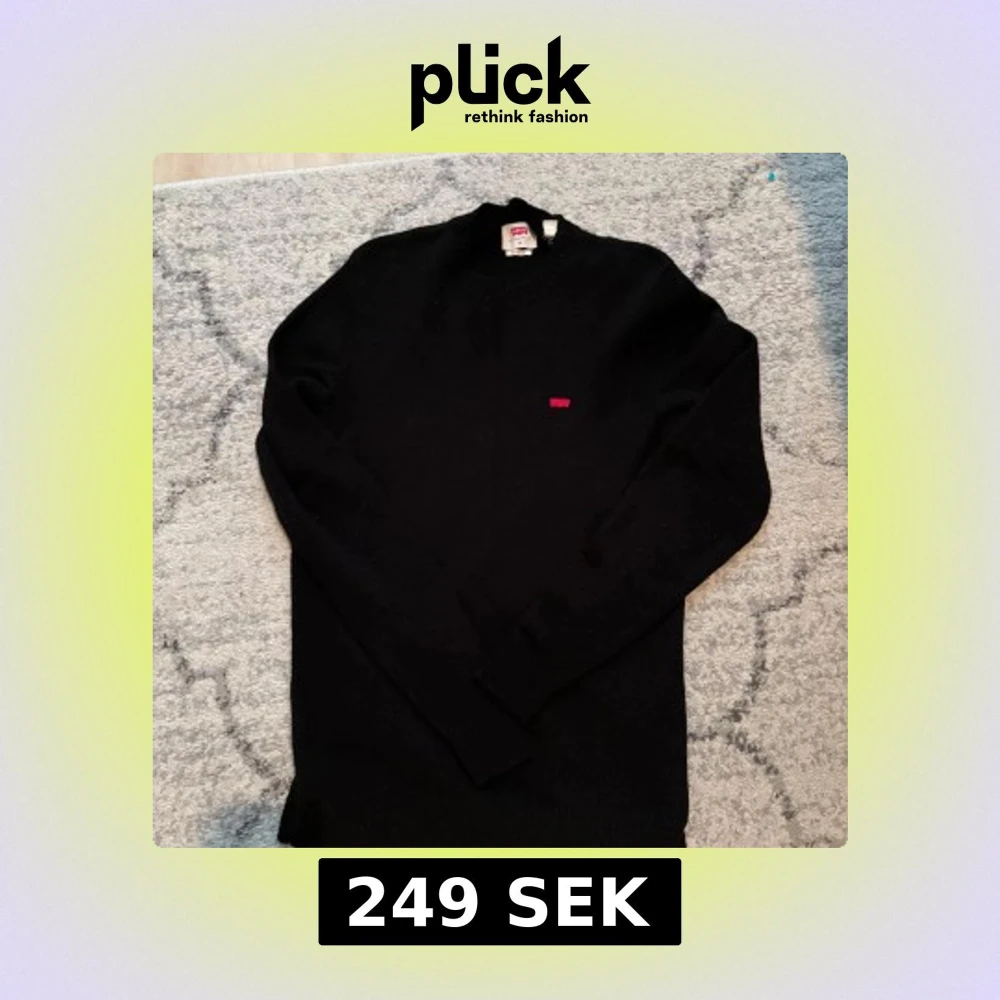 Säljer en svart stickad tröja från Levi's med rund halsringning och diskret röd logga på bröstet. Tröjan har långa ärmar och ribbade muddar vid ärmslut och nederkant. Perfekt för lager-på-lager-stil.