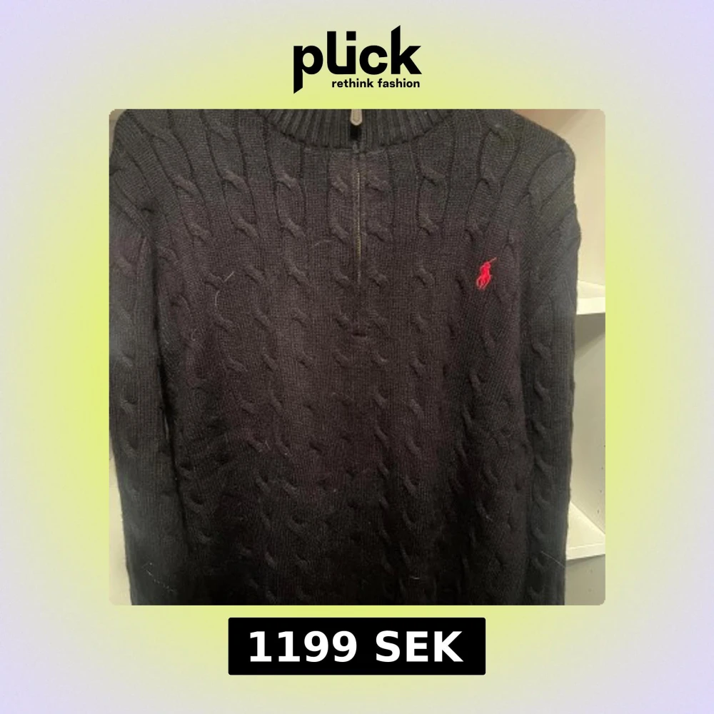 Svart kabelstickad tröja från Polo Ralph Lauren med röd broderad logga på bröstet. Tröjan har half zip-dragkedja vid halsen och är långärmad med ribbade muddar. Perfekt för dig som gillar klassisk och stilren look. Den är ull och kashmir