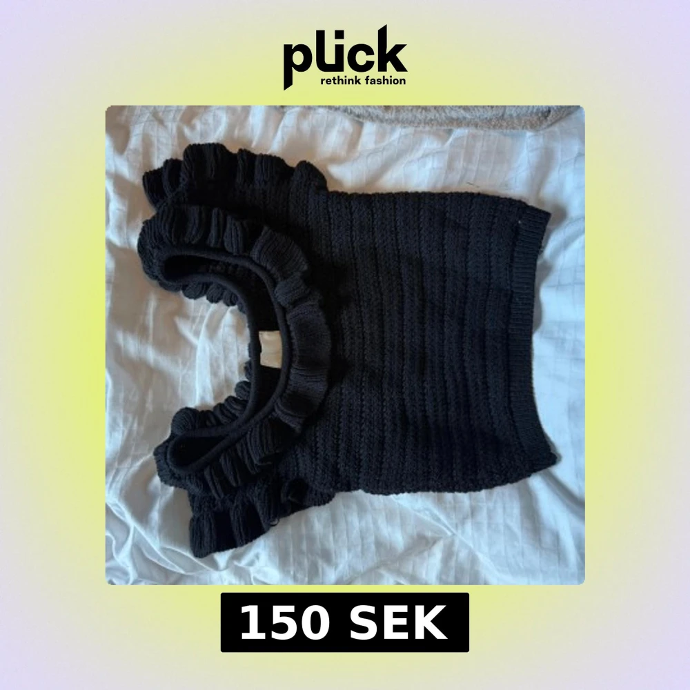 Supersöt svart stickad topp från H&M med breda volanger längs axlar och halsringning. Toppen är ärmlös och har en chunky, ribbad struktur som ger en cool och trendig look. Perfekt att styla med jeans eller kjol för en extra touch.