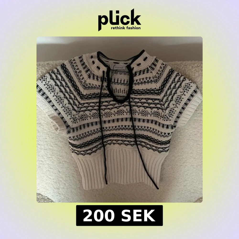 Säljer en snygg svartvit stickad topp från Zara med korta ärmar och ett dekorativt snöre vid halsen. Toppen har ett detaljerat mönster och ribbad nederkant. Använt 1 gång. Den är i storlek s. Pris kan diskuteras 💕