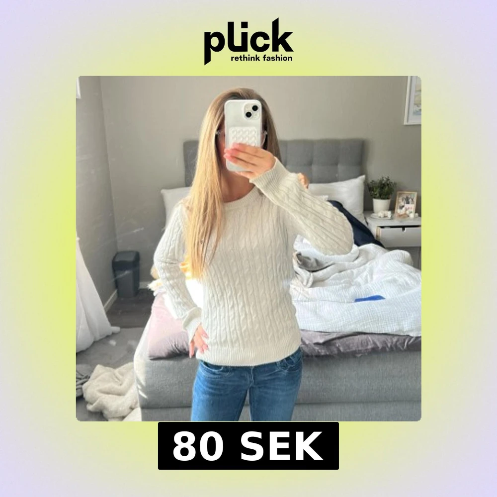 Vit kabelstickad tröja från Svea med rund halsringning och broderad logga på bröstet finns några fläckar på vissa ställen💗