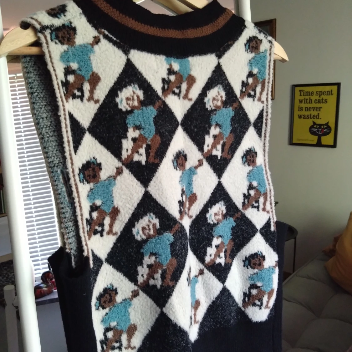 Fluffig, mönstrad väst med ett "checkerboard" tema. Motiv av dansande björnar. Eklektisk academia vibes.