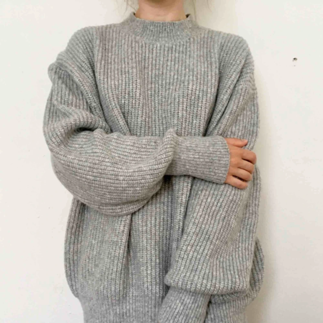 Stickad grå tröja i strl L. Jag är 1,55m och såhär sitter den på mig. Toppskick!