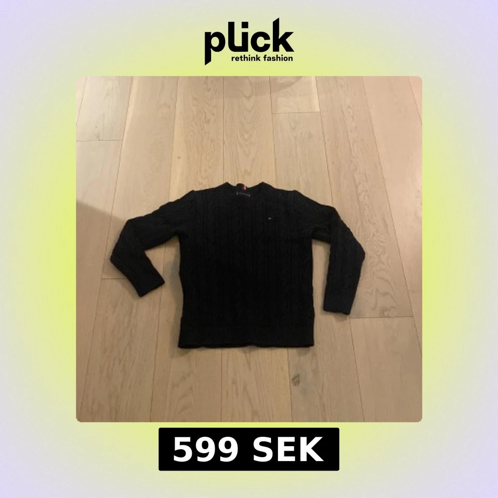 Säljer en stilren svart stickad tröja från Tommy Hilfiger. Tröjan har ett klassiskt flätmönster och en liten logotyp på bröstet.