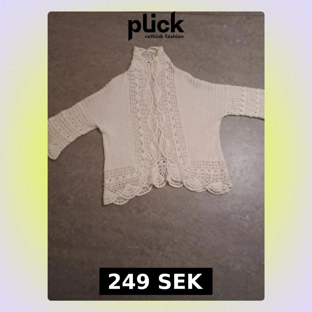 ✨️Säljer en söt vit stickad kofta med virkade spetsdetaljer längs kanterna, ärmsluten och nederkanten. Koftan har trekvartsärmar och ett öppet fall framtill. Perfekt för lager på lager och ger en romantisk touch till din outfit.✨️