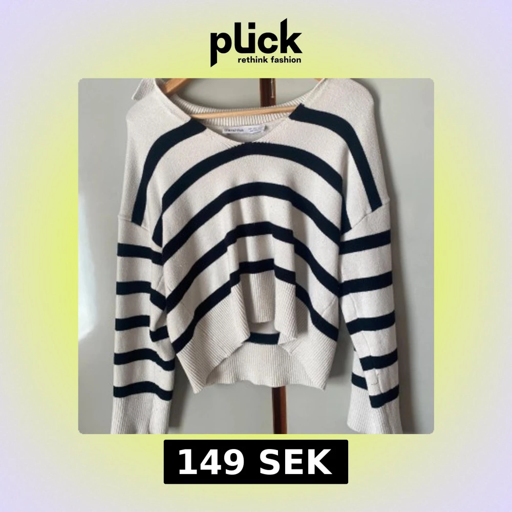 Säljer en vit och svart randig tröja från Bershka. Tröjan har lång ärm, bred rund halsringning och är stickad i mjukt material. Perfekt för en avslappnad och trendig look.