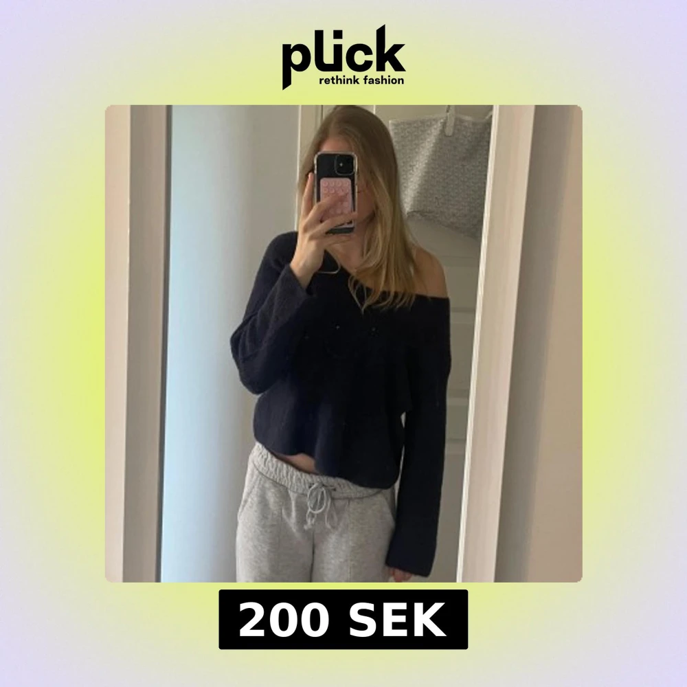 Säljer en marinblå off-shoulder tröja med croppad design. Storlek S🤍🫶🏽