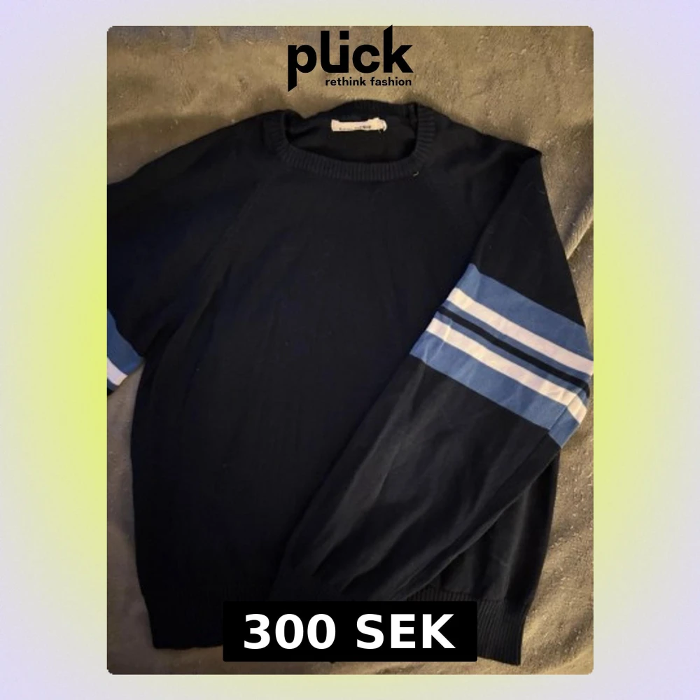 Snygg mörkblå stickad tröja med ljusblå och vita ränder på ärmarna. Tröjan har rund halsringning och ribbade muddar vid ärmslut och nederkant. Perfekt för en avslappnad och sportig stil.
