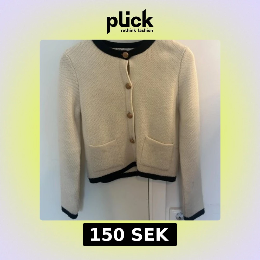Snygg beige stickad kofta från Zara med svarta kanter vid hals, ärmslut och nederkant. Guldiga knappar framtill. Storlek m men är liten i storlek så skulle säga storlek xs-s. Köptes för 400. Mycket bra skick