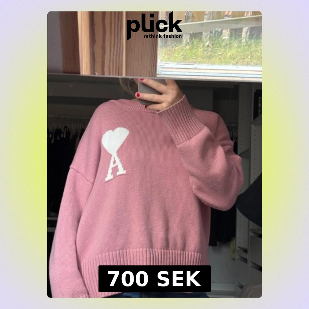 INTREKOLL!!! Superfin rosa stickad tröja från Ami med ett vitt hjärta och bokstaven A på bröstet. Tröjan har en loose passform, ribbade muddar och rund hals. Perfekt för dig som gillar snygga detaljer och vill ha en mysig vibe. Såå fin och cool🩷🩷🩷