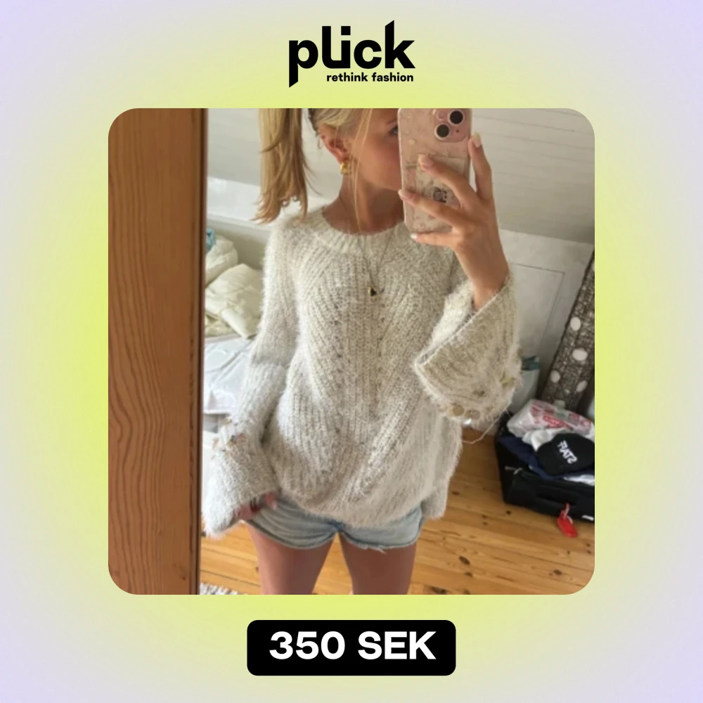 Beige lurvig tröja, vet ej märke. Detaljer, typ paljetter på ärmarna. Lite glittrig tråd i själva tröjan. Bra skick. Pris går att diskuteras.