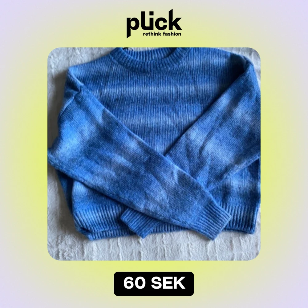 En stickad tröja med olika blå färger, lite kortare i modellen och den är inte så len som många stickade tröjor är. Har aldrig använt den. Bra skick!