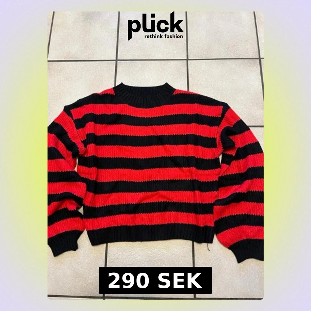 Säljer en riktigt snygg stickad tröja med breda röda och svarta ränder. Tröjan har en loose passform, rund halsringning och långa ärmar. Perfekt för dig som vill ha en statement piece i garderoben. Supermjuk och skön att bära.