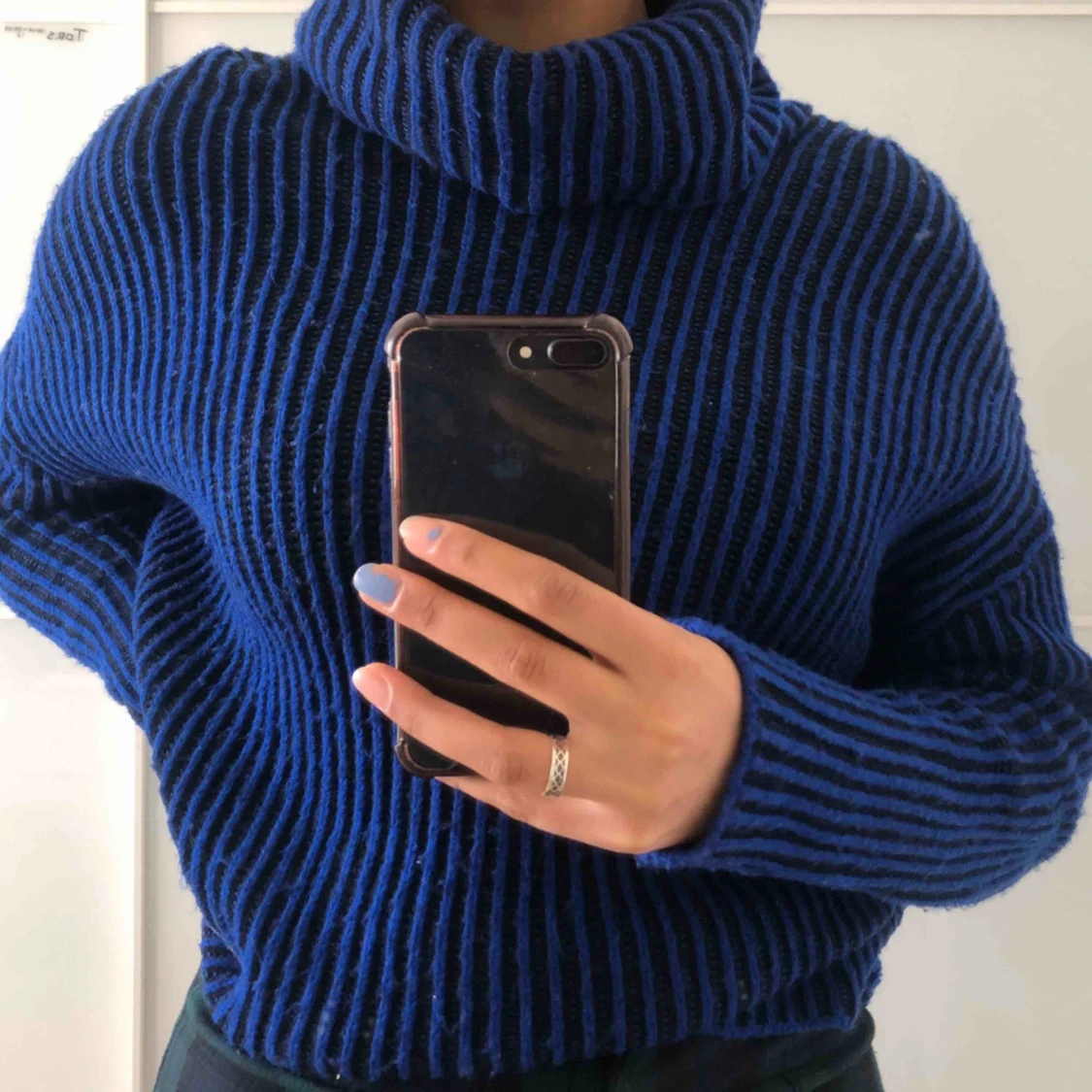 Blåsvart stickad tröja med stor mysig krage. Köparen står för frakt, kan mötas i centrala sthlm