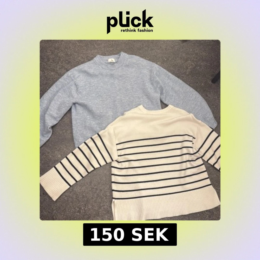 Säljer två stickade tröjor: en ljusblå med rund hals och en beige med svarta ränder och bred ribbad mudd. Båda har lång ärm och är perfekta för lager-på-lager-stil. Sköna och stilrena basplagg för garderoben. (Säljer båda tillsammans för 150kr)