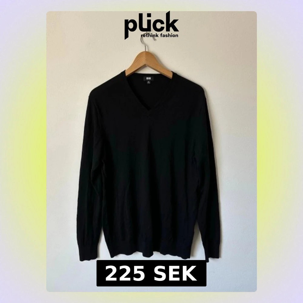 Klassisk svart stickad tröja från Uniqlo med V-ringning och långa ärmar. Tröjan har en enkel och stilren design med ribbade muddar vid ärmslut och nederkant. Perfekt basplagg för lager på lager och funkar året runt. 8D9