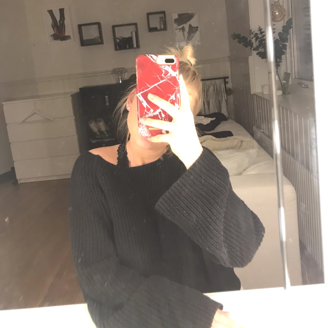 Svart stickad tröja med utsvängda armar från H&M. Möts upp/ fraktas då köparen står för frakten:) (swish)