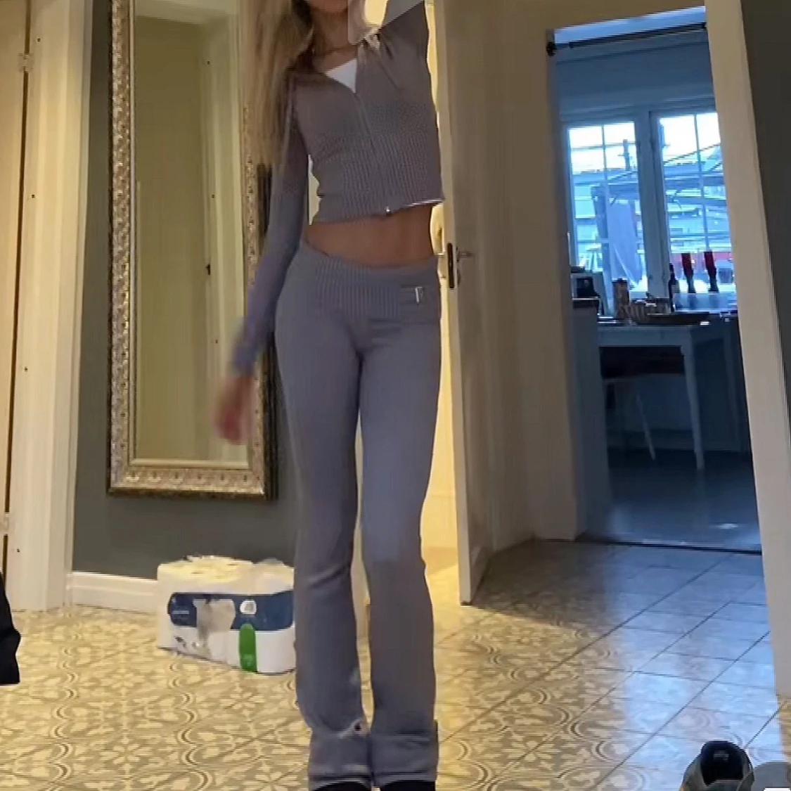 Ljus grått stickat sett som jag tyvärr måste ge vidare då de var för korta i benen på mig :( super mjukt tyg. För referens är jag 170cm. Koftan har även en luva, fler bilder på settet finns!❤️Skriv bud i kommentarerna på bilden så har jag lite koll!🌷