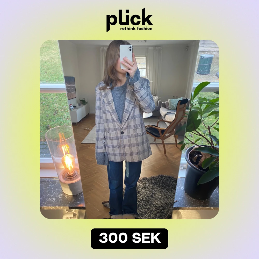 Säljer en snygg rutig kavaj i beige och grå toner. Den har en klassisk passform med knappar framtill och långa ärmar. Perfekt för höst och vår, och funkar både till vardags och fest. Passar bra över en stickad tröja för en stilren look 🩶🤍