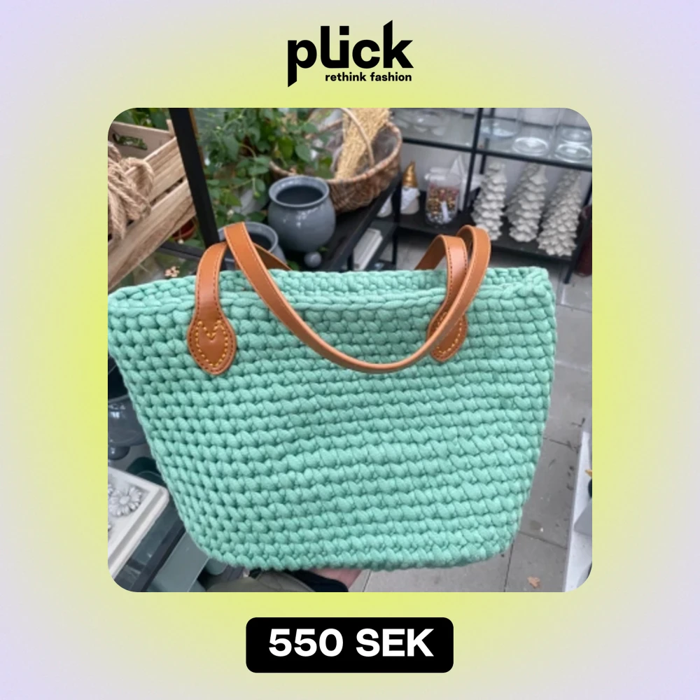 Säljer en superfin mintgrön virkad väska med snygga bruna läder handtag i skinn. Väskan har en stabil läder botten med små metallfötter som skyddar den när du ställer ner den. Den är både stilren och praktisk, perfekt för en dag på stan.