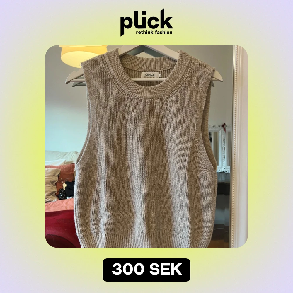 Säljer en snygg beige stickad väst från ONLY. Perfekt för lager-på-lager under hösten eller våren. Den har en ribbad kant vid ärmhålen och nederkanten för en stilren look. Passar bra till både skjorta och t-shirt.