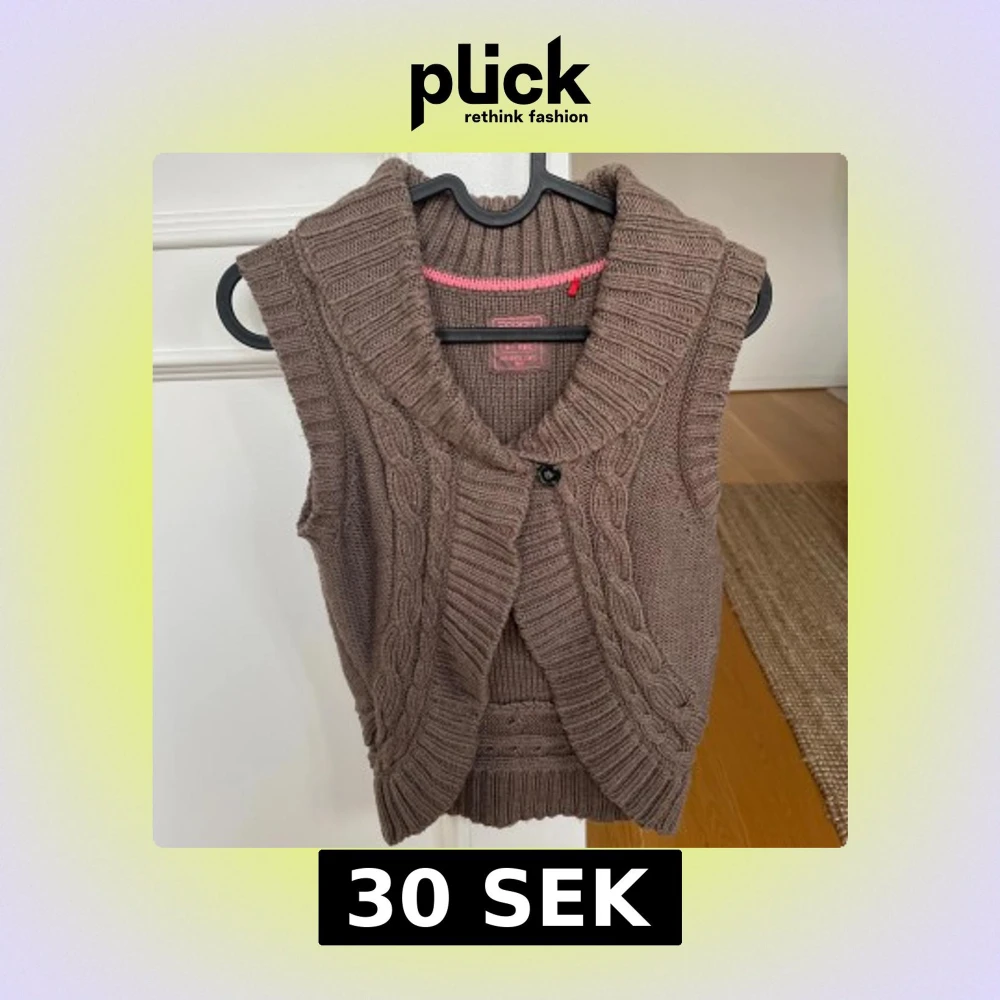 Säljer en mysig brun stickad väst från Esprit med flätstickat mönster och en stor krage. Västen har en knapp framtill och ribbade kanter. I barnstorlek 140/146 i fint skick🤎