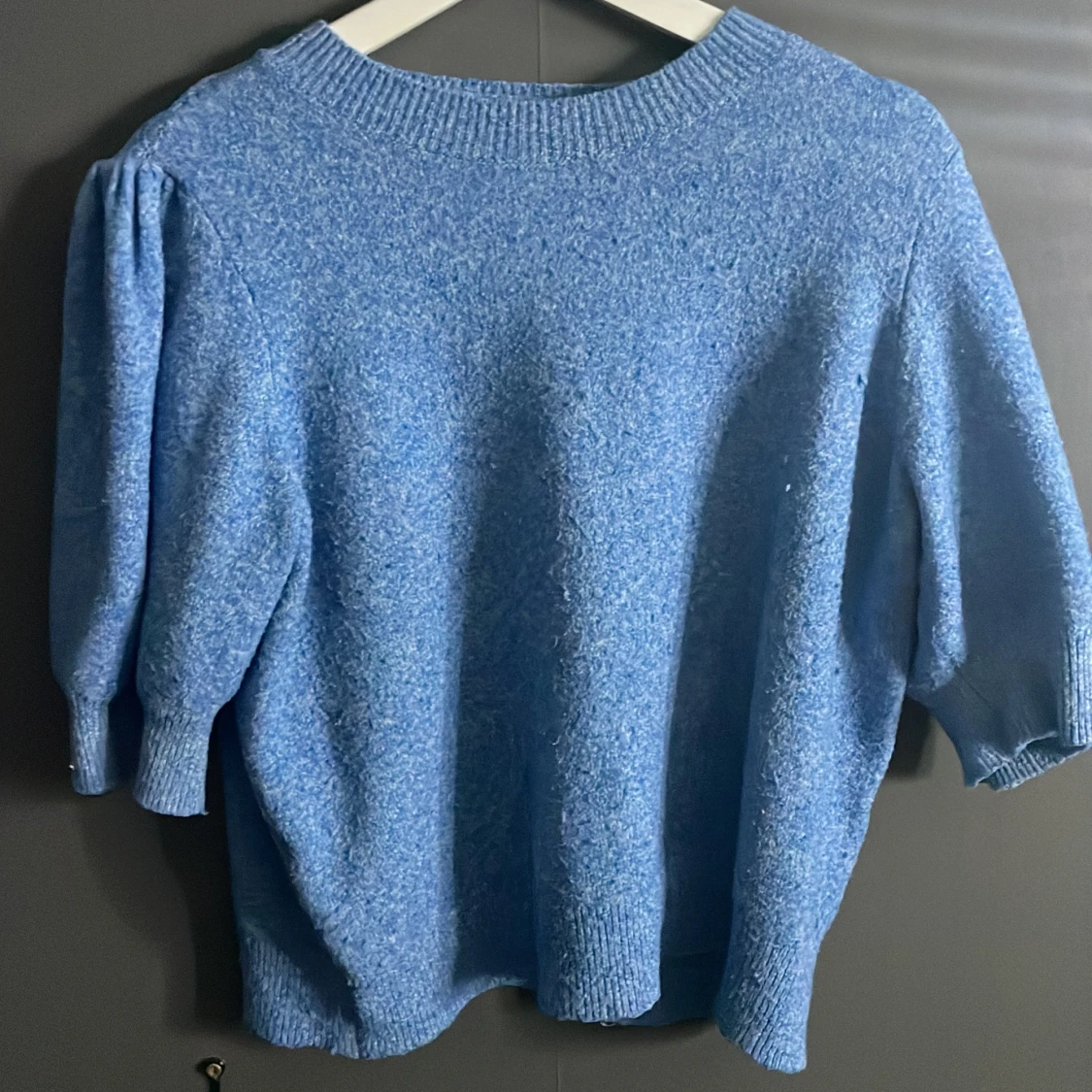 Säljer en mysig blå stickad tröja från Vero Moda. Korta armar💙Tröjan har inga fläckar eller hål, LITE noppig men de tänker man inte på!💙pris kan sänkas vid snabb affär🤗